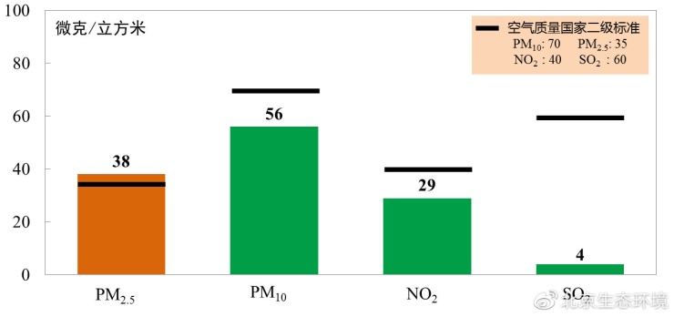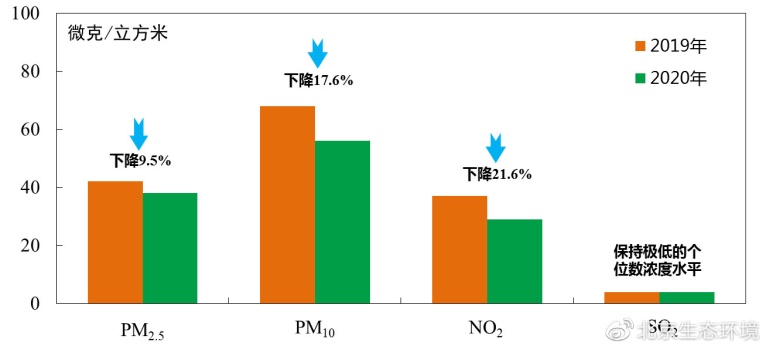 2020年北京市大氣環(huán)境中PM2.5等四項(xiàng)主要污染物同比均明顯改善,其中PM2.5年均濃度為38微克/立方米,首次達(dá)到“30+”水平,同比下降9.5%;可吸入顆粒物(PM10)、二氧化氮(NO2)連續(xù)兩年達(dá)到國(guó)家二級(jí)標(biāo)準(zhǔn);二氧化硫(SO2)年均濃度穩(wěn)定達(dá)到國(guó)家標(biāo)準(zhǔn)并保持個(gè)位數(shù)水平。