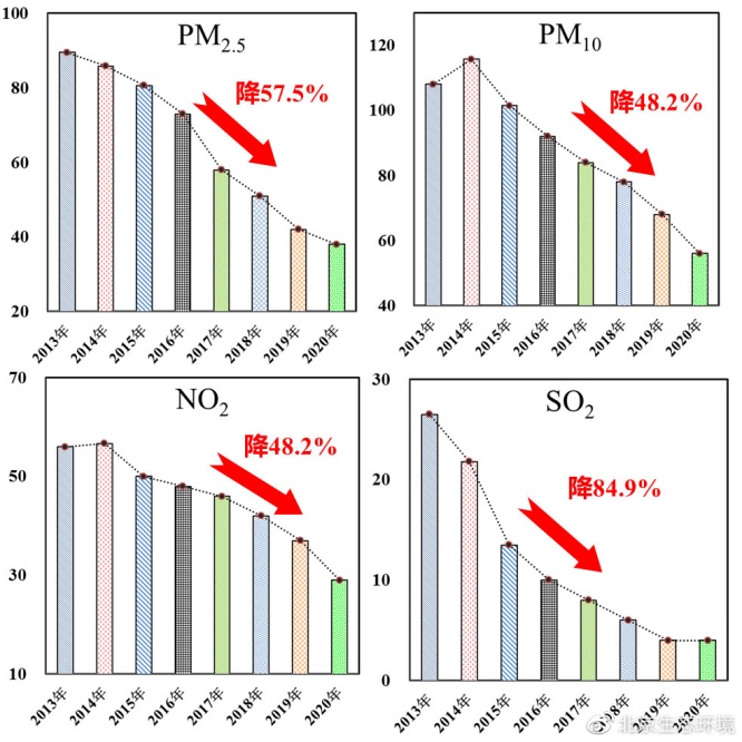 近年來(lái)全市主要污染物年均濃度均顯著下降。與2013年相比,2020年大氣四項(xiàng)主要污染物PM2.5、PM10、NO2、SO2分別下降57.5%、48.2%、48.2%、84.9%。