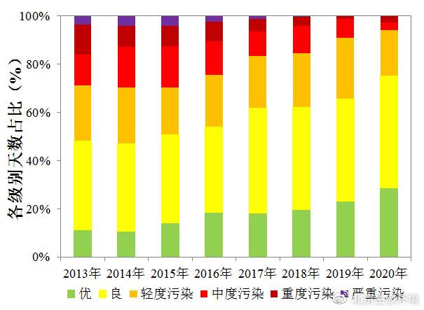 全年3/4的天數(shù)為優(yōu)良天,“好天”比去年多了一個(gè)多月。2020年,全年空氣質(zhì)量?jī)?yōu)良天數(shù)為276天,較上年增加36天,優(yōu)良率達(dá)到75.4%,增加9.6個(gè)百分點(diǎn),空氣質(zhì)量?jī)?yōu)良天數(shù)明顯增加。其中,一級(jí)優(yōu)天數(shù)為106天,較上年增加21天,二級(jí)良天數(shù)為170天,較上年增加15天。2020年全年未出現(xiàn)嚴(yán)重污染日;發(fā)生重度污染日10天,其中7天首要污染物為PM2.5,3天為O3。