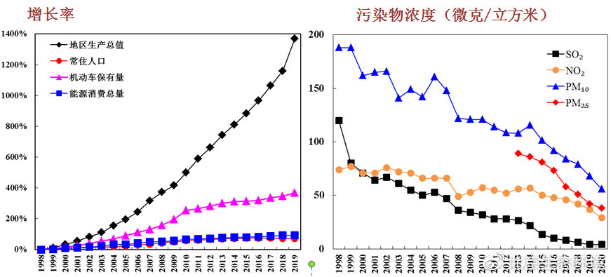 (圖10 1998年以來(lái)北京市地區(qū)生產(chǎn)總值、常住人口、機(jī)動(dòng)車(chē)保有量、能源消耗總量增速與各項(xiàng)污染物濃度變化趨勢(shì))